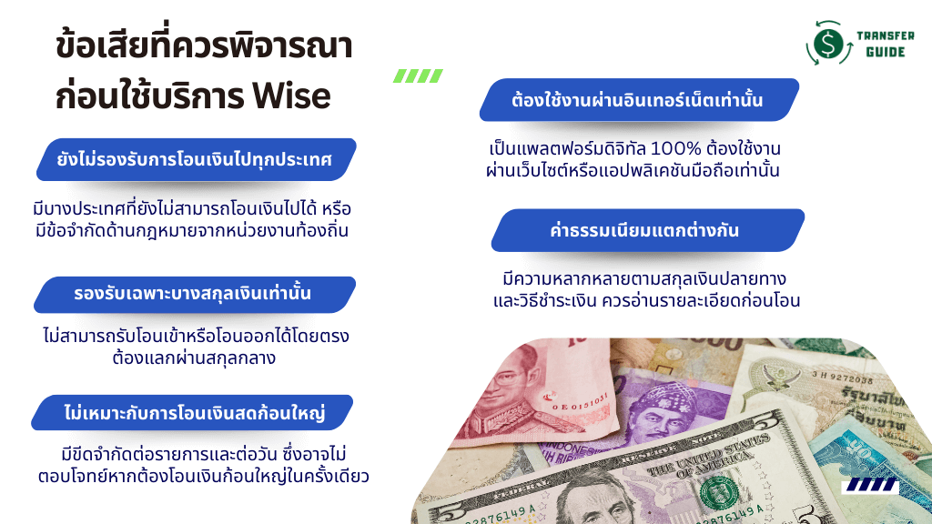 - ข้อเสียในการใช้บริการ Wise มีบางประเทศที่ยังไม่รองรับการโอน บางสกุลเงินยังโอนโดยตรงไม่ได้ต้องผ่านสกุลเงินกลาง ไม่เหมาะกับการโอนเงินก้อนใหญ่ ต้องใช้บริการผ่านอินเตอร์เน็ตเท่านั้น